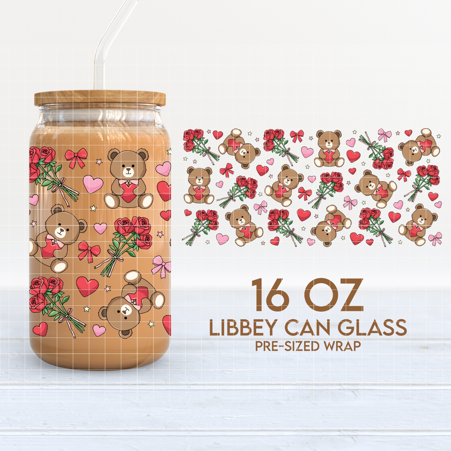 Bears & Roses Cup Wrap | Valentine's Day 16oz Libbey Can Glass | Love You PNG SVG