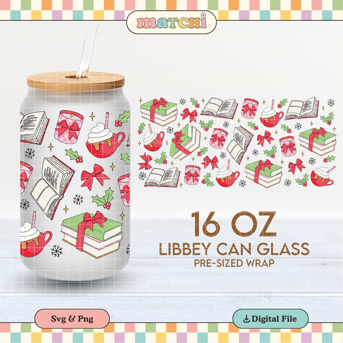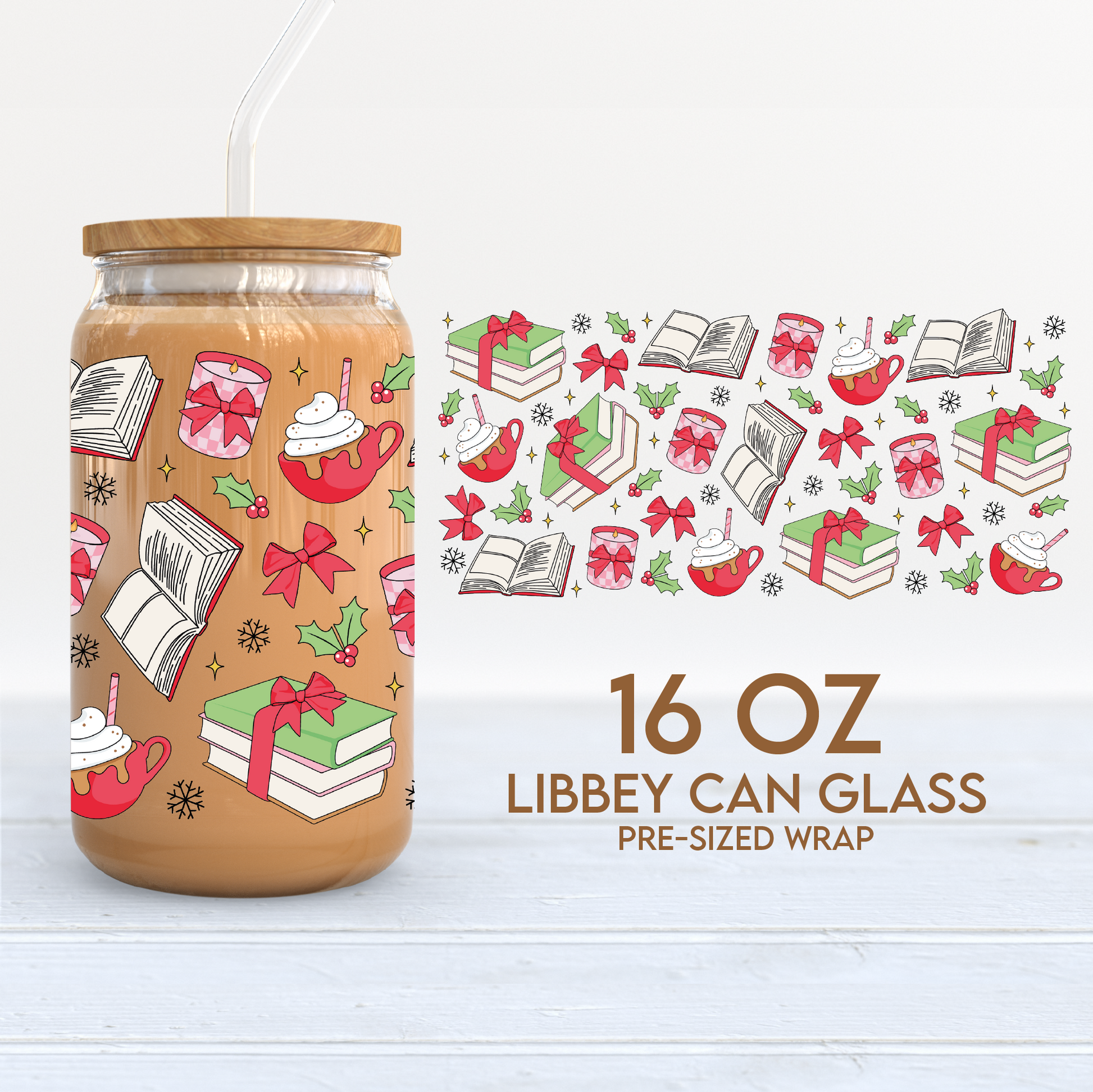 Bookish Xmas Things Cup Wrap | Christmas 16oz Libbey Can Glass | Books PNG SVG