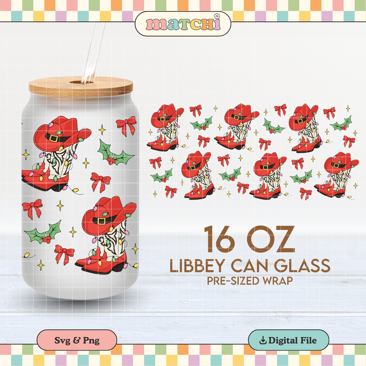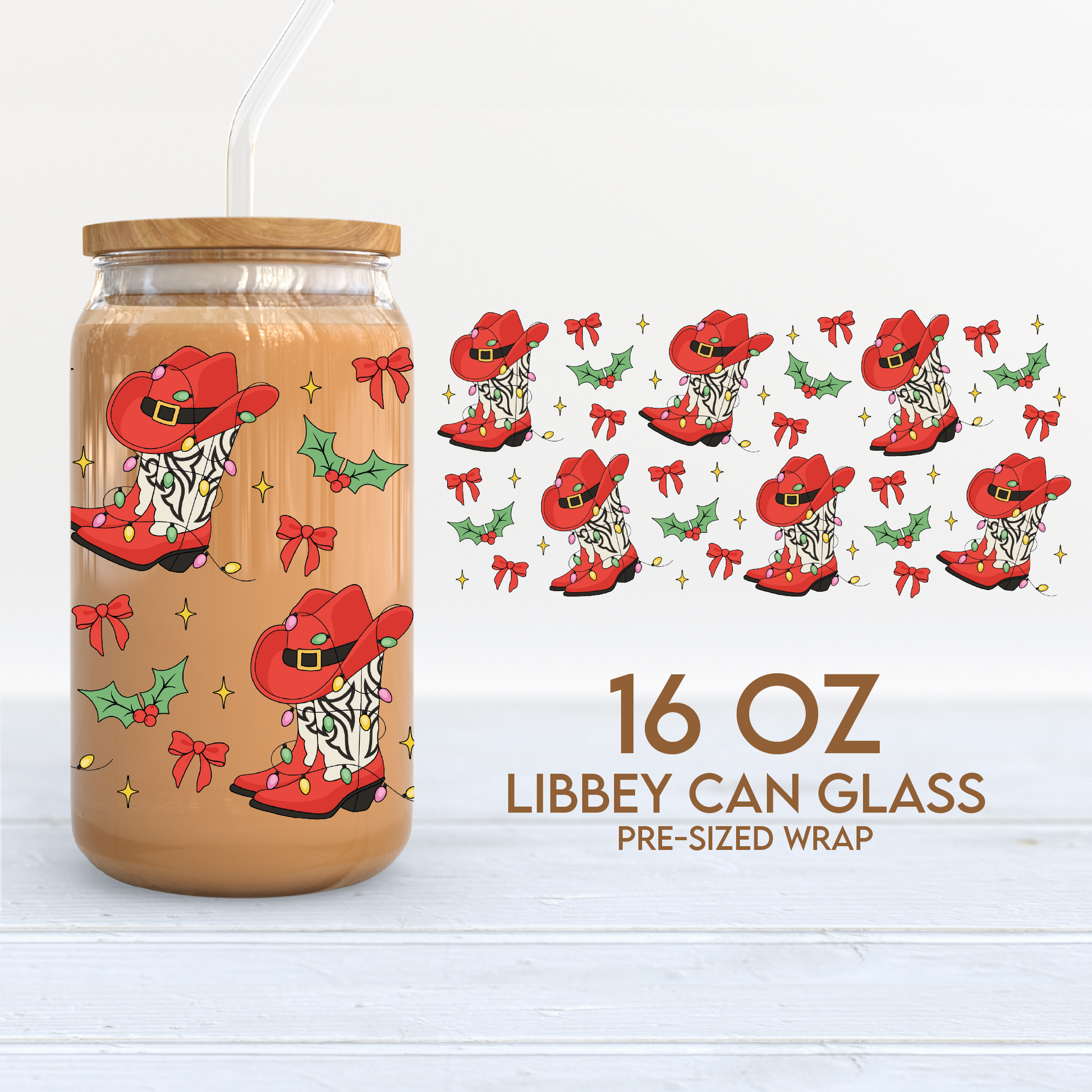 Christmas Cowboy Boots Cup Wrap | Western 16oz Libbey Can Glass | Xmas PNG SVG