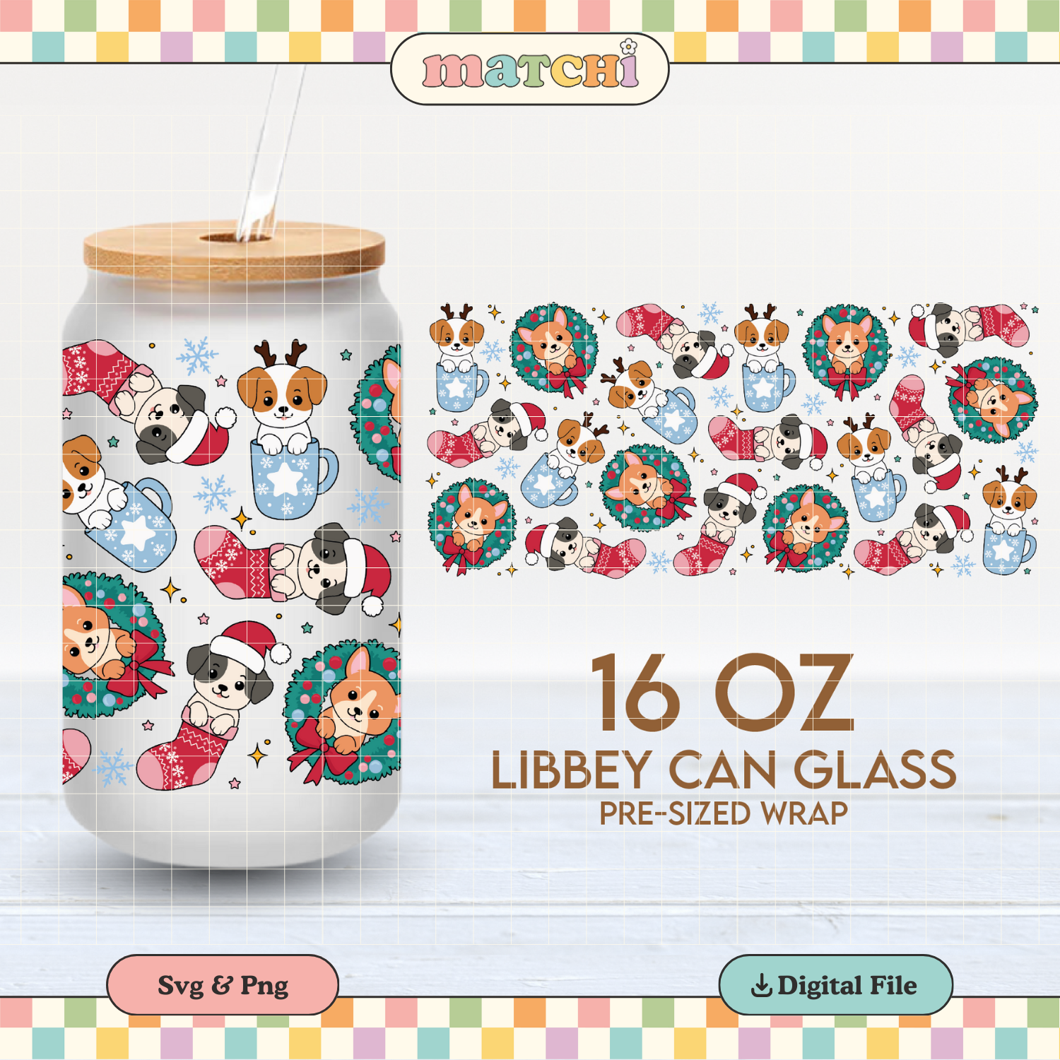 Christmas Cute Dogs Cup Wrap | Xmas Pets 16oz Libbey Can Glass | Christmas PNG SVG