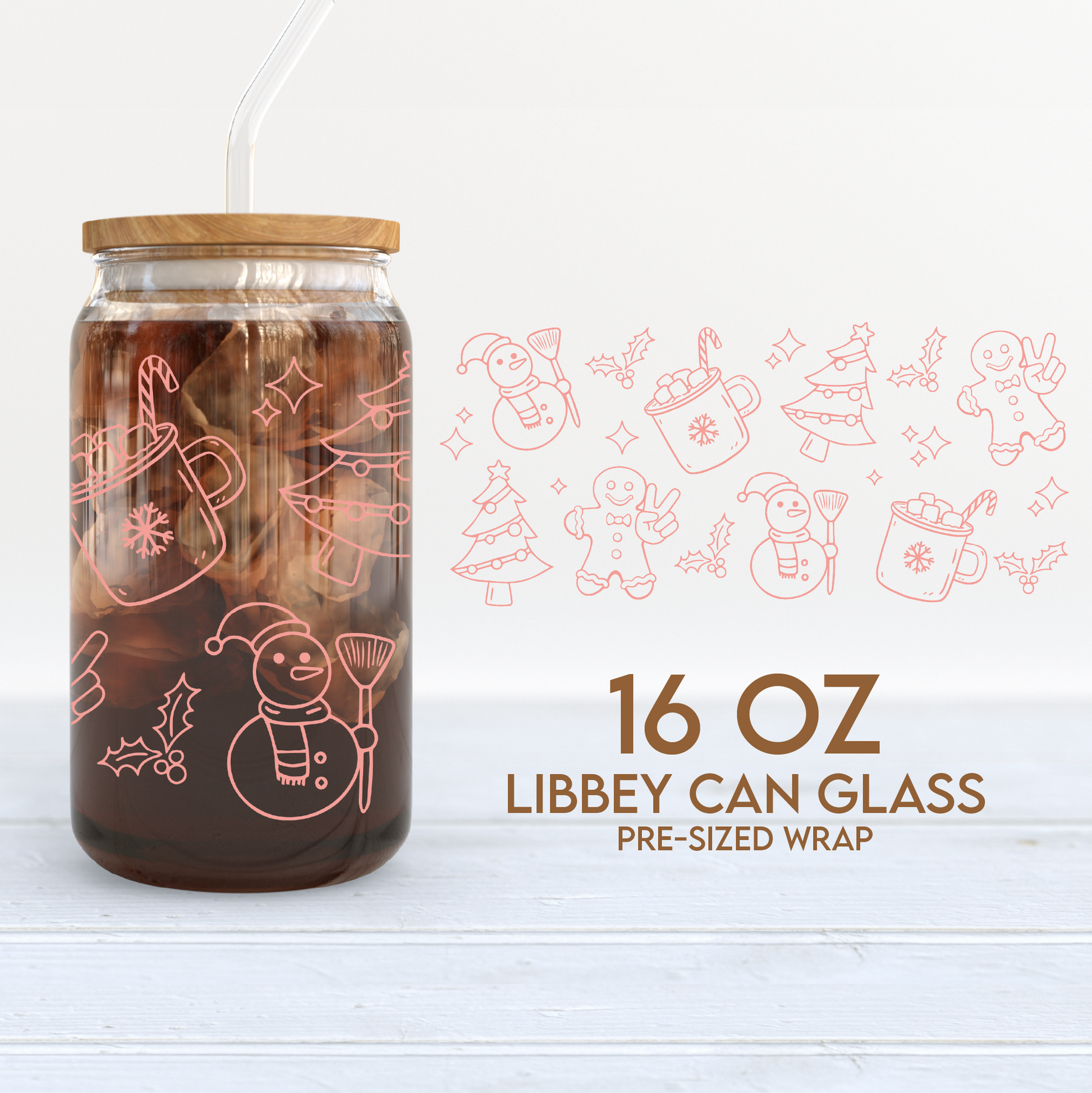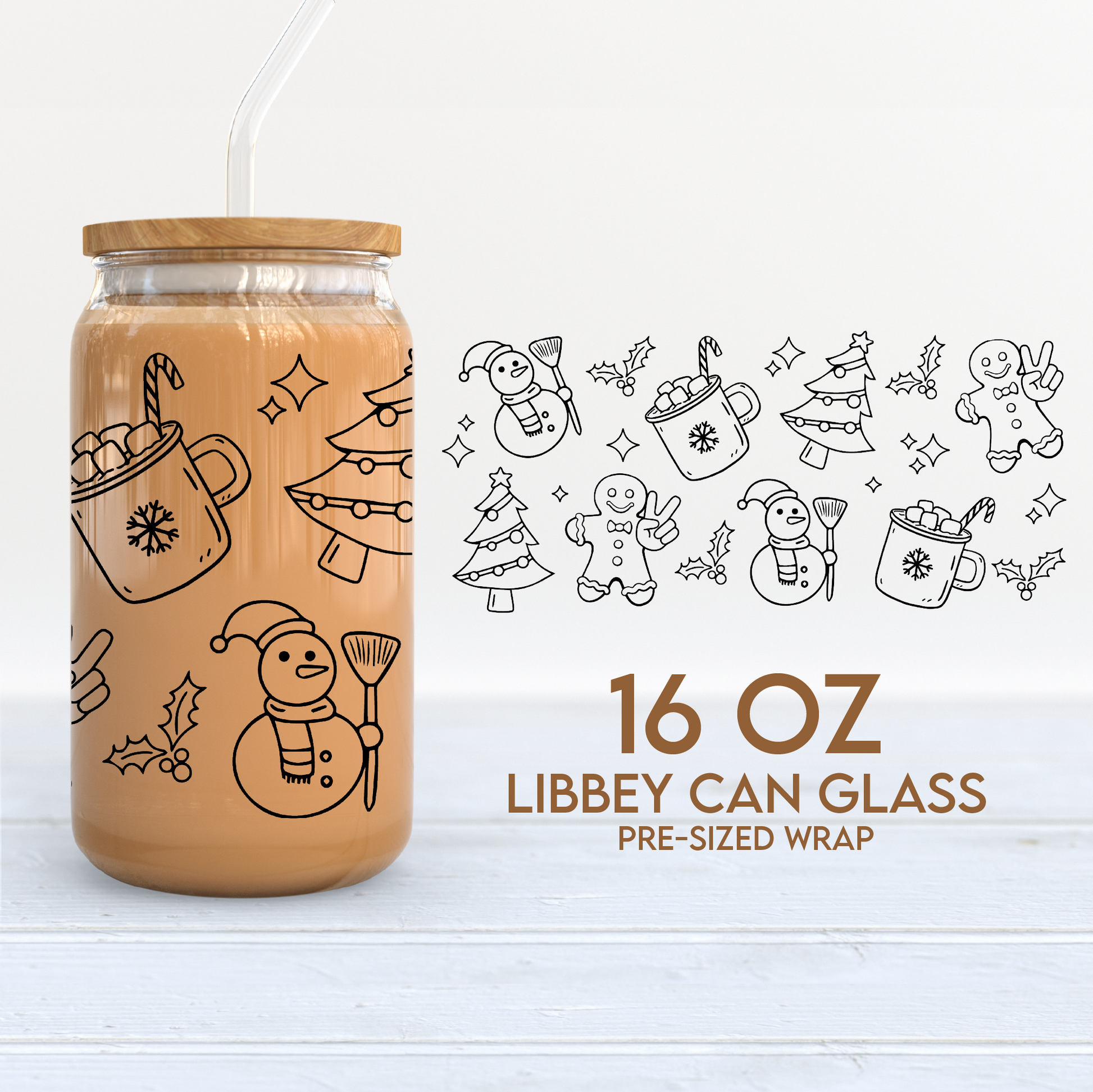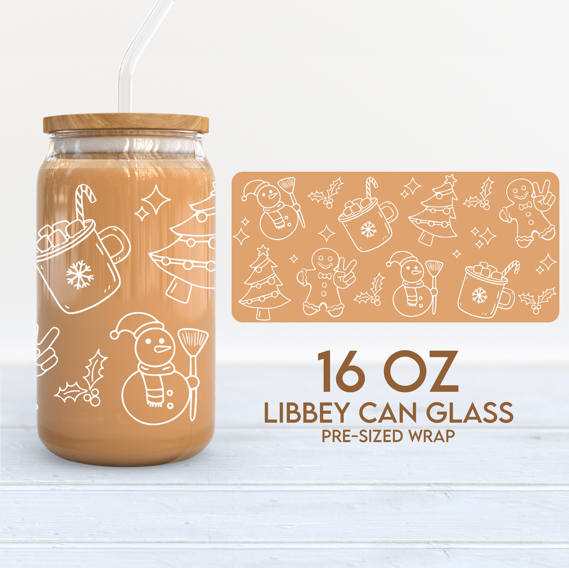 Christmas Things Outline Cup Wrap | 16oz Libbey Can Glass | Christmas Doodles PNG SVG