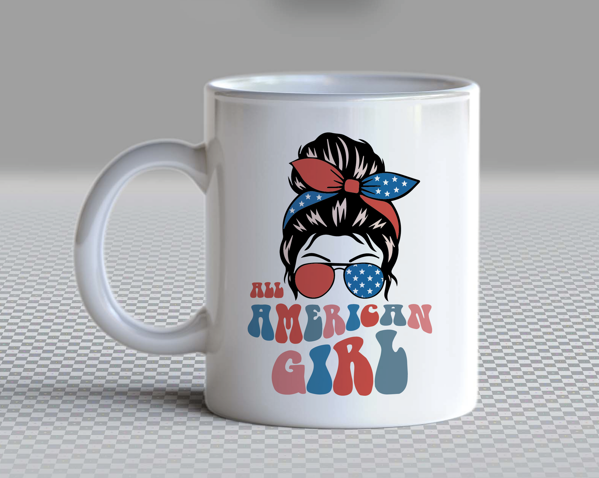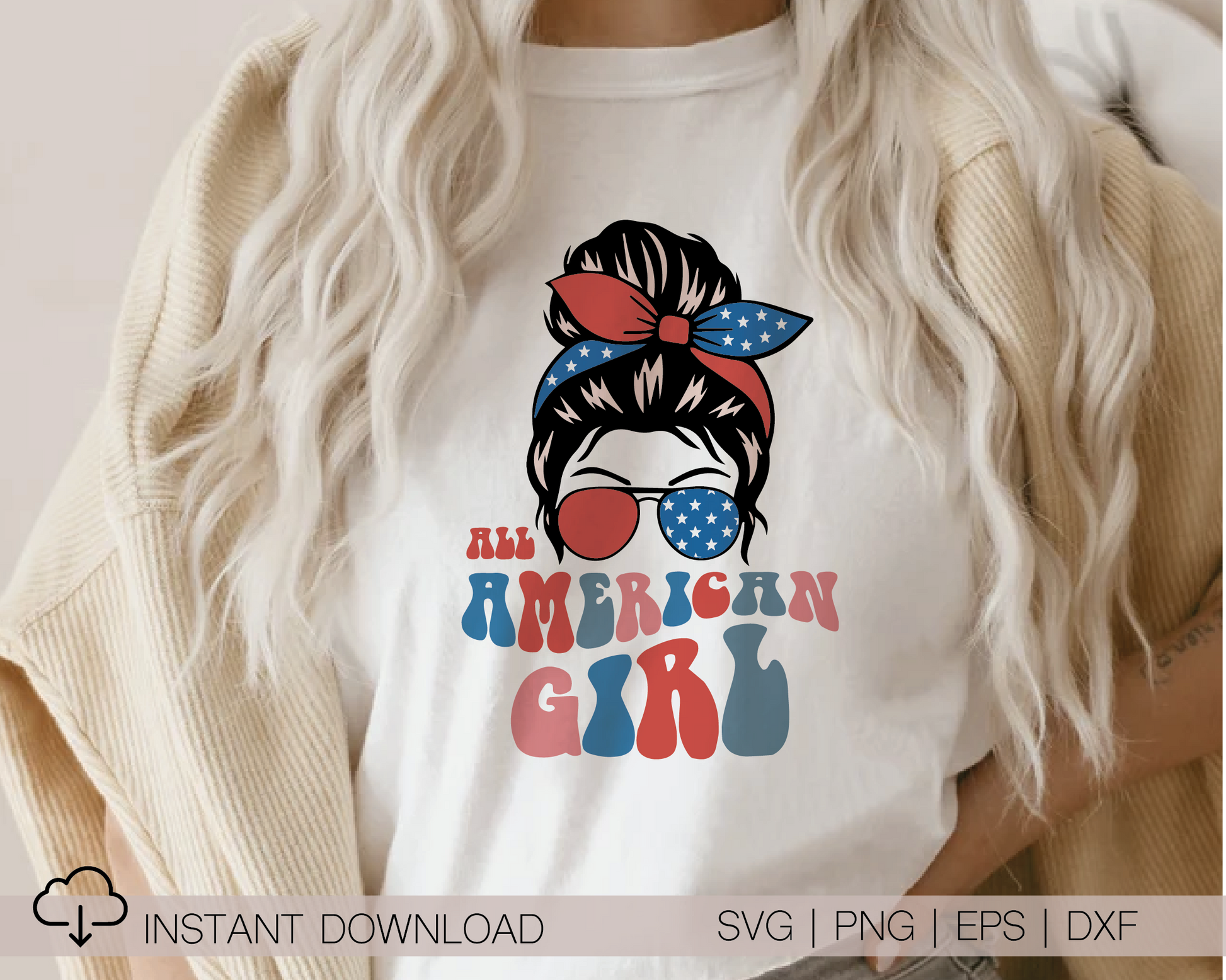 All American Girl SVG PNG | Messy Bun Sublimation | Fourth of July | Retro Vintage T shirt Design