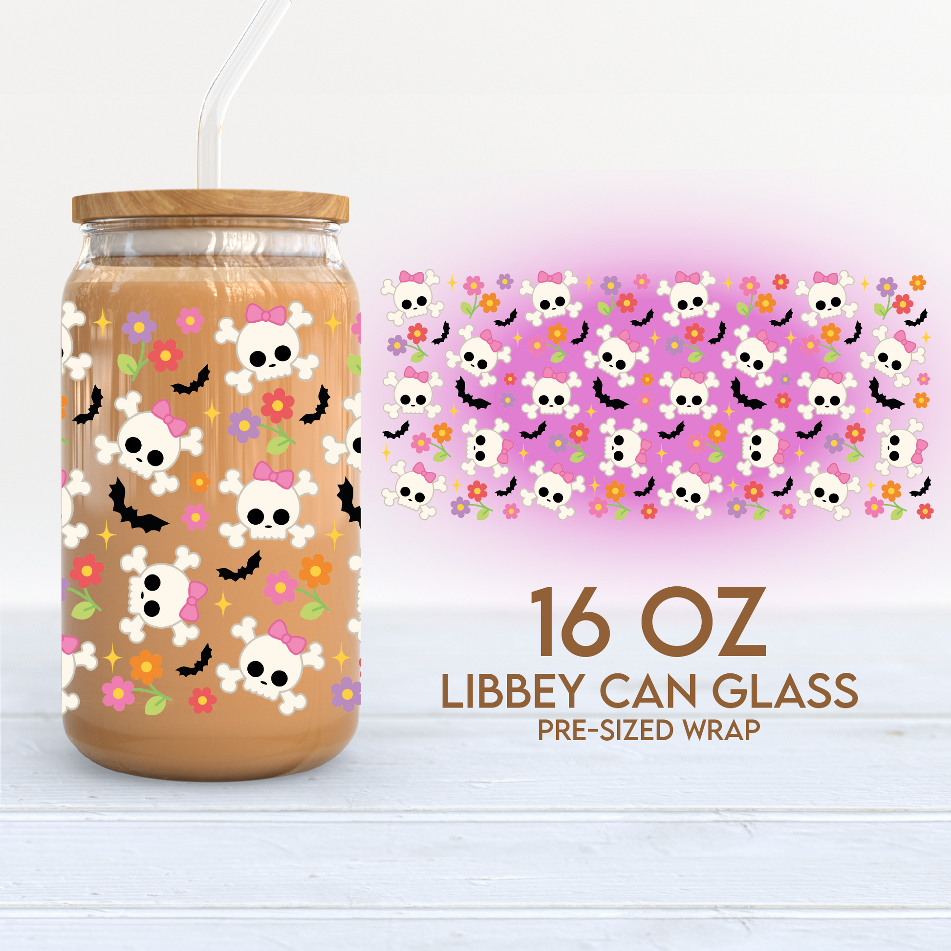 Cute Skulls Cup Wrap | Halloween 16oz Libbey Can Glass | Cute Spooky PNG SVG