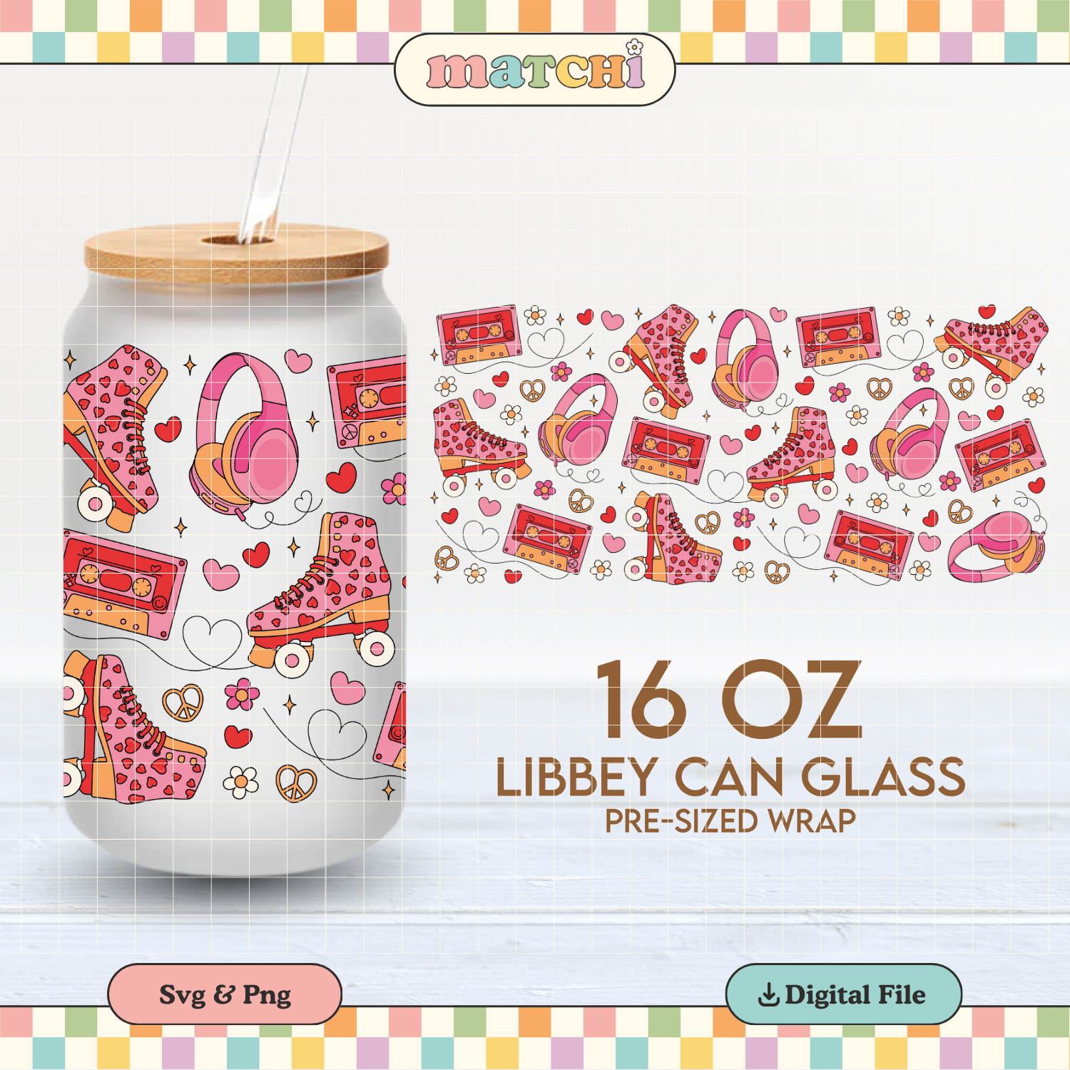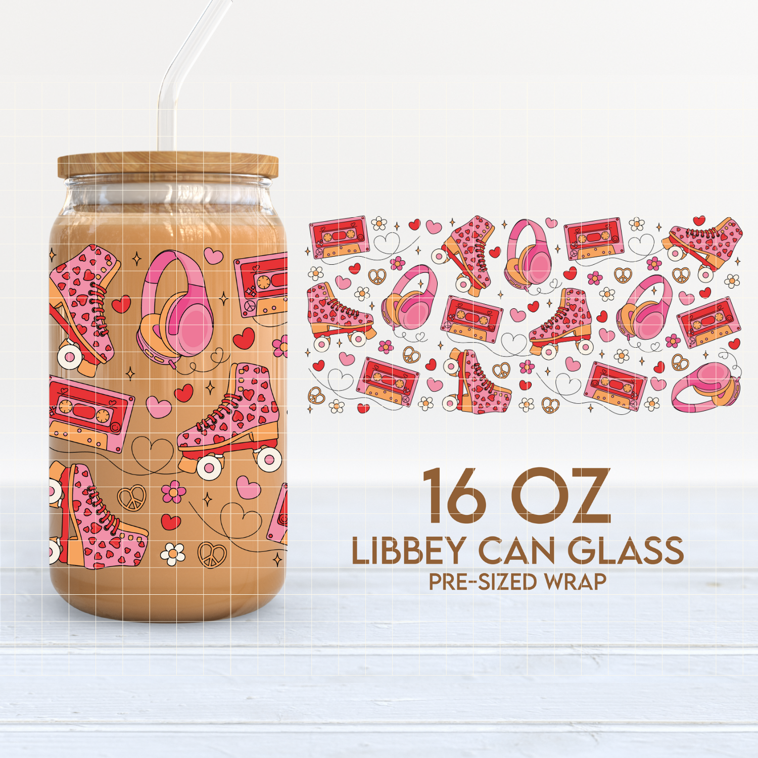Love Roller Skates Cup Wrap | Groovy Valentines 16oz Libbey Can Glass | PNG SVG