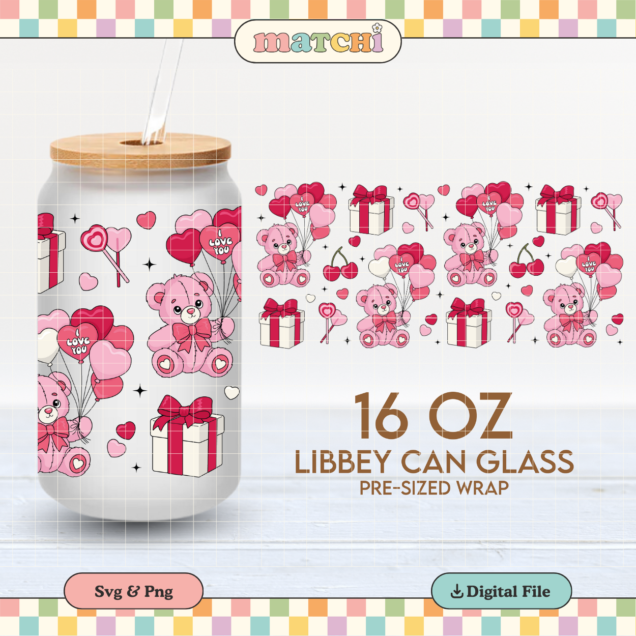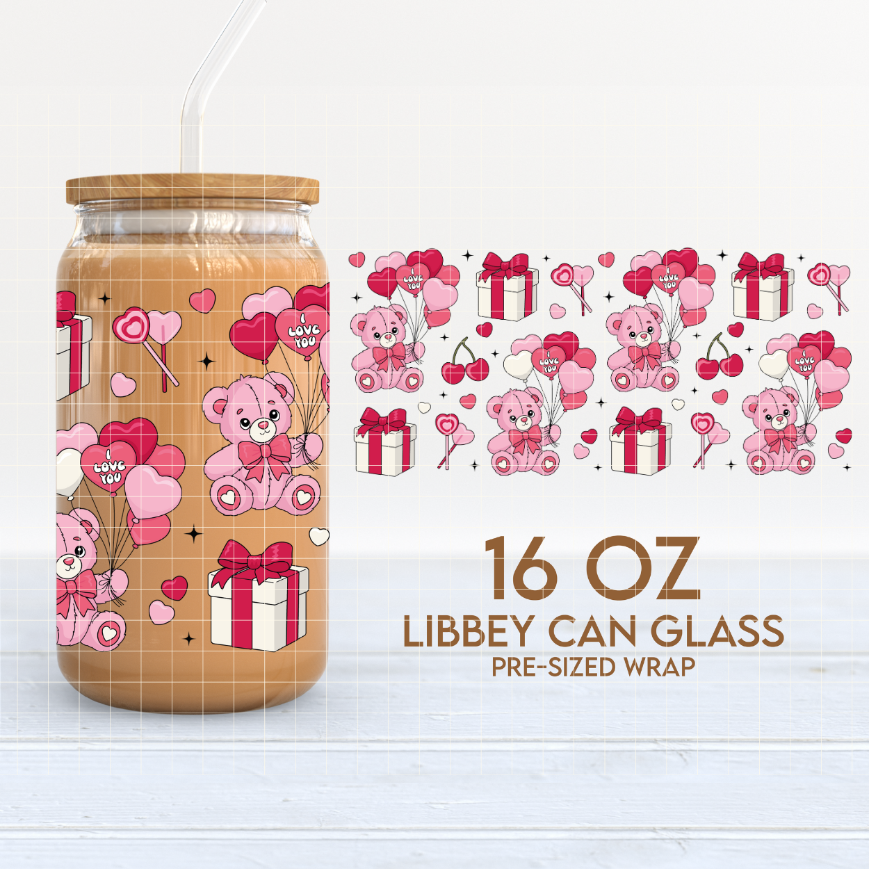 Pink Bear & Presents Cup Wrap | Coquette Valentines 16oz Libbey Can Glass PNG SVG